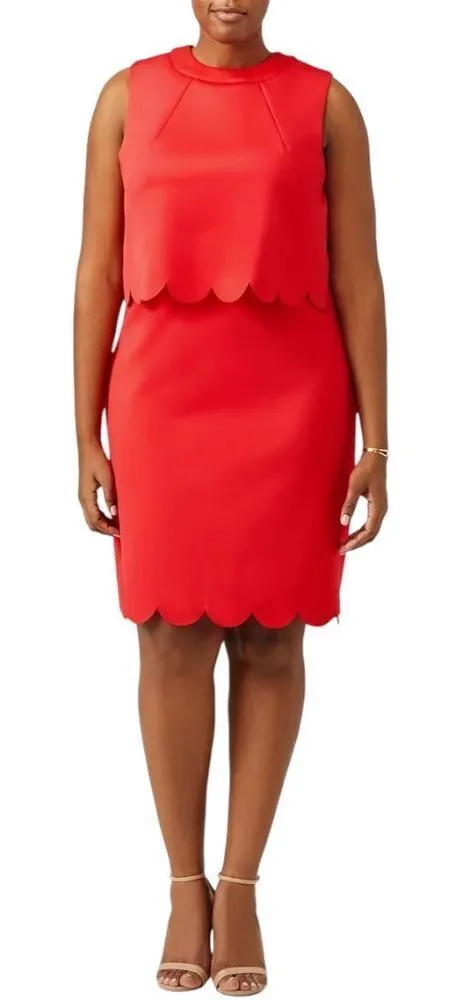 Anthropologie ELOQUII Women's Red Scalloped Overlay Dress Plus Size 16 Stretch This layered red dress by Eloquii has feminine scalloped hemlines. It's perfect for work, a date night, or a party! Red neoprene Sleeveless Crew neckline Shift Exposed back zipper Imported Polyester, Spandex Blend Reasonable offers are accepted. See photos for approximate measurements. From a smoke free, pet friendly home. Holidays, holiday party, office party, Career wear, workwear, office, work, professional, demure, stylish, classic, classy, dinner, daye