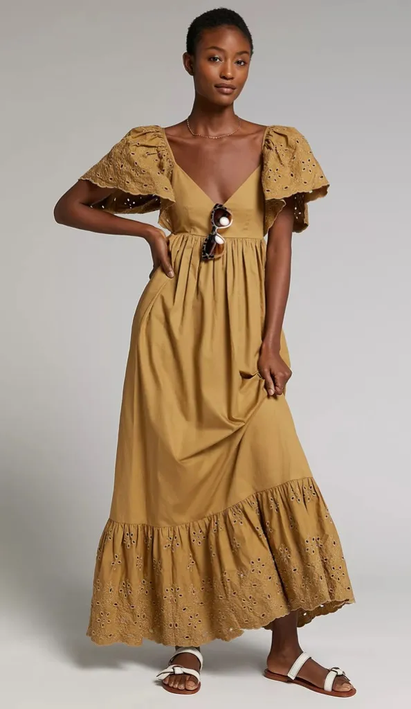 flounced hem and dainty eyelet details infuse this dress with texture and femininity. Cotton Eyelet sleeve detail V-neck Side slant pockets Maxi silhouette Flounced hem Side zip New never worn Size xs 15” pit to pit 54” shoulder to hem