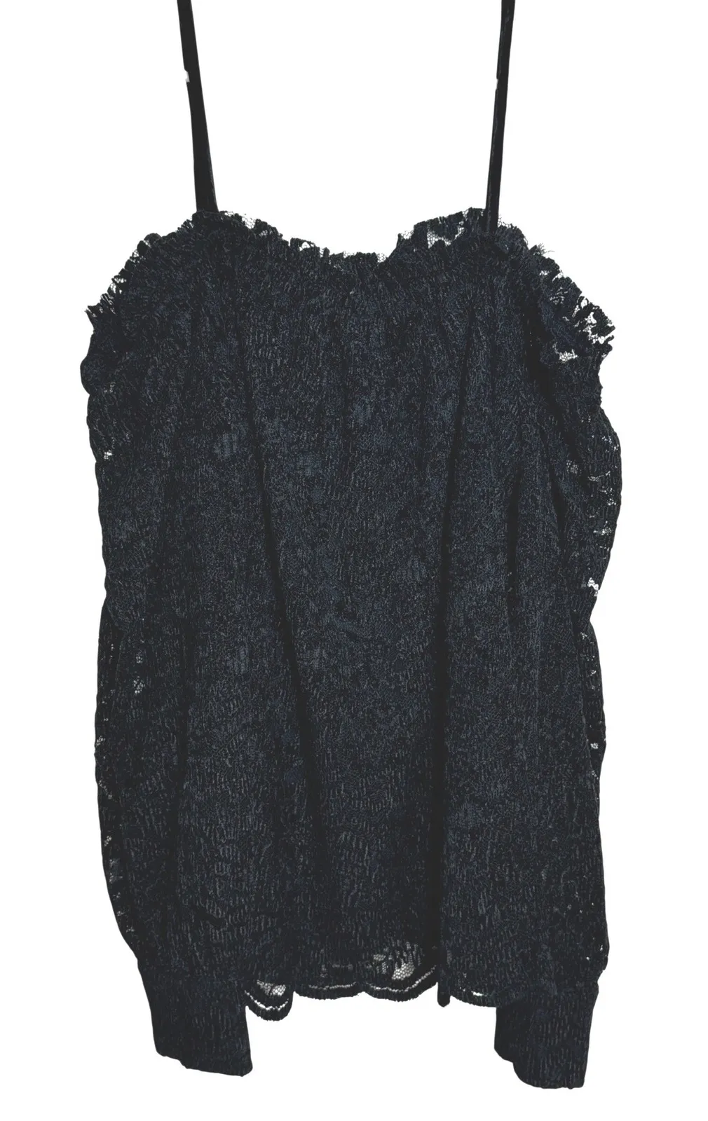 Type: Blouse Department: Women Style: Camisole Material: Polyester Neckline: Scoop Neck Sleeve Length: Sleeveless Sleeve Type: Strappy Sleeve Pattern: Solid Accents: Ruffle, Strap Fabric Type: Lace Occasion: Party/Cocktail, Casual Closure: Pullover Season: Summer, Spring Keywords: lace top, ruffle trim, off shoulder, sheer, romantic, evening wear, date night, party, feminine, cocktail, elegant, goth, Whimsigoth