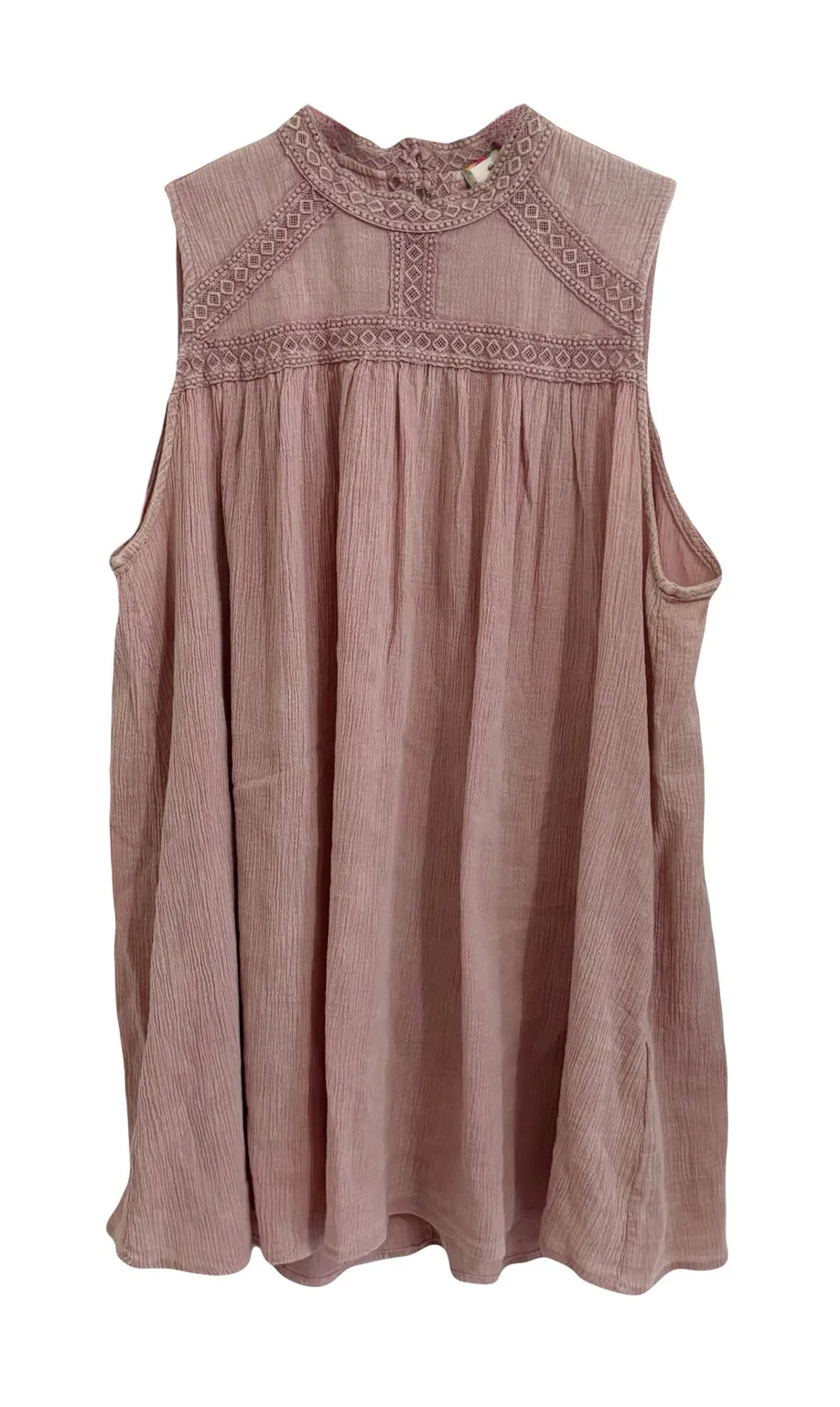 Sleeveless / Relaxed Fit / High Neck Dusty pink color with a gauzey texture Embroidery detailing a... Show more