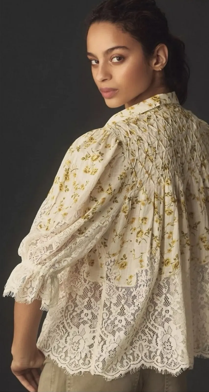 Anthropologie Victorian Lace Blouse Ivory Green Yellow MSRP $130 Size Large Laying Flat / Appr... Show more