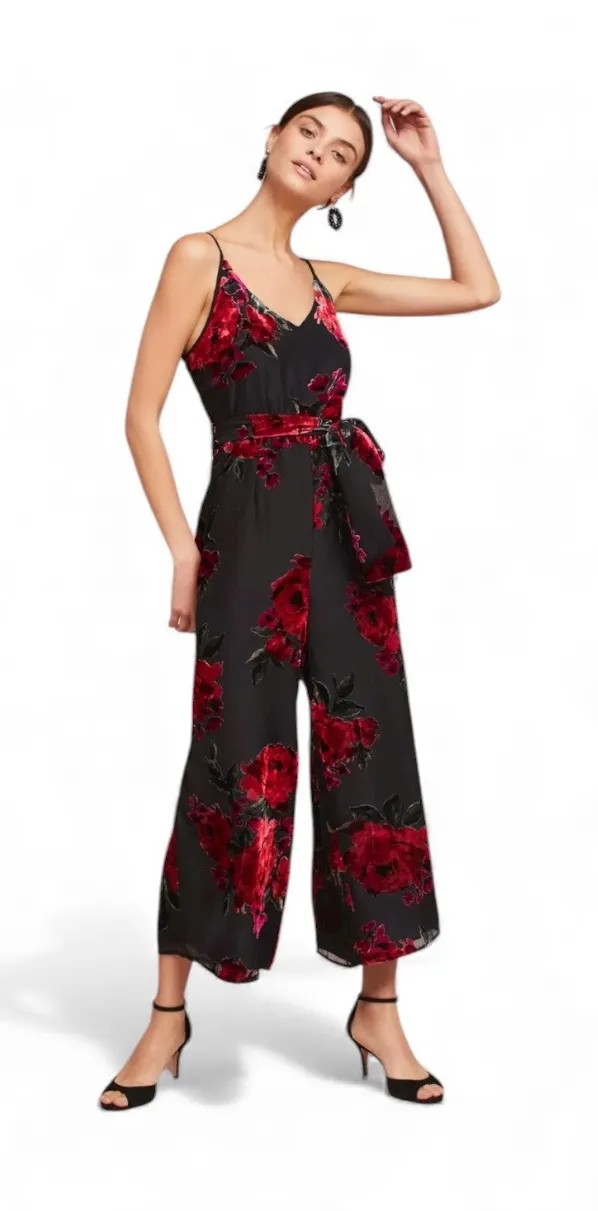 In great condition! Black with red velvet florals all over. Wide leg style in a lightweight chiffon.... Show more