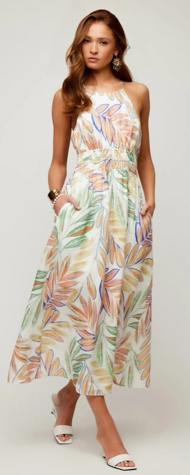 Anthropologie Fifteen Twenty Eden linen Sundress Sz Medium Tropical Print Coastal boho chic