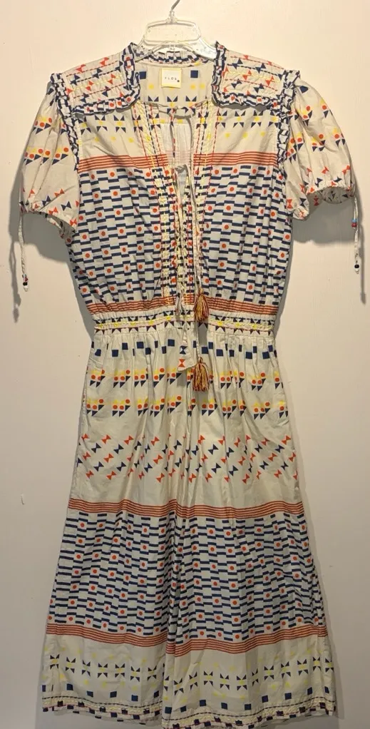 Colorful jumpsuit with geometric patterns. Features blue, yellow, and orange shapes. Perfect for a v... Show more