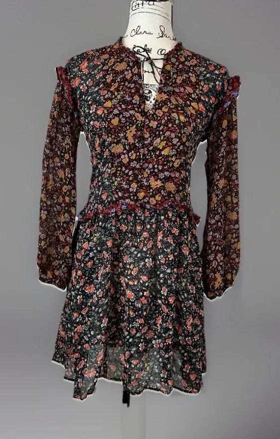 Keywords: Anthropologie, floral dress, mini dress, ruffle trim, long sleeve, viscose, boho, bohemian, party dress, casual dress, womens dress, xs dress, floral print, dress