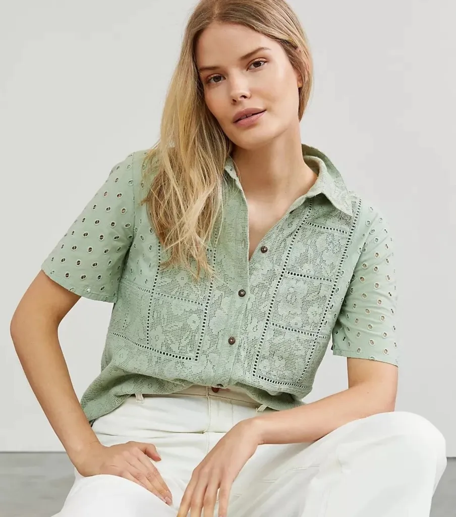 Anthropologie Forever That Girl Green Fern Eyelet Lace Buttondown Size small