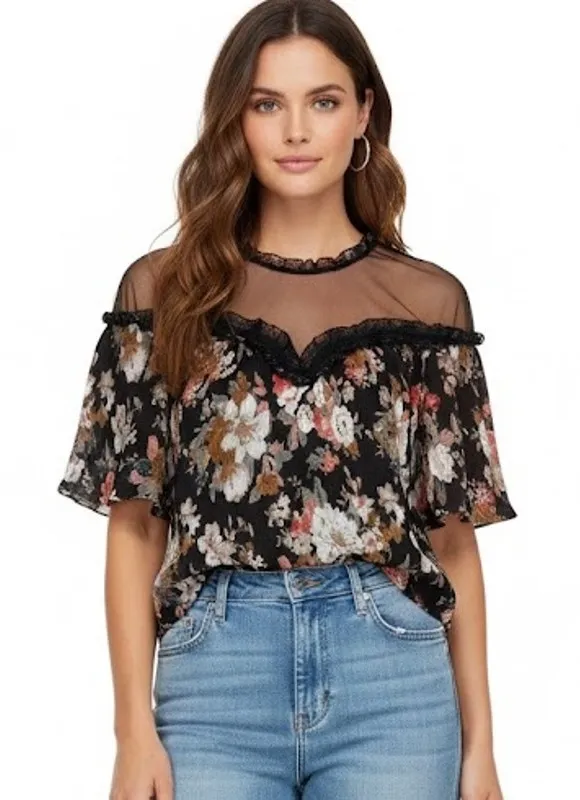 Short sleeve top. Black with coral, tan, cream floral print. Sheer mesh top with lace detail. High n... Show more