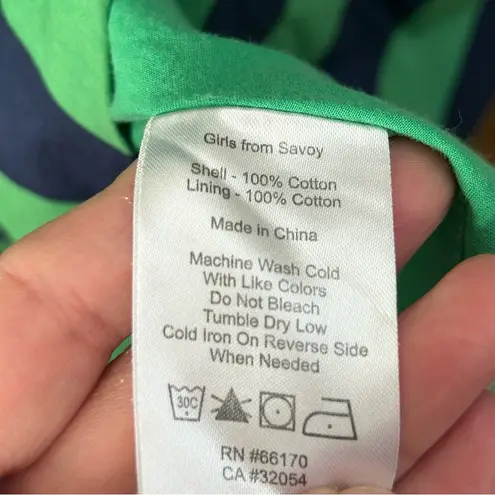 ANTHROPOLOGIE Girls From Savoy Emerald Ripple Dress Chevron Button Front Size 4 GIRLS FROM SAVOY ~ “Emerald Ripple Dress” Green & Blue Chevron Print Throughout Sleeveless Midi A-Line Interior Lining Open Side Pockets Gold Tone Button Front Closure Round Tie Neckline With Cut Out *Pls Note: Front Snap Button At neckline a bit loose. Small tear under one gold button (pls refer to last 2 pics) ABSOLUTELY GORGEOUS!!! GREAT CONDITION!!!