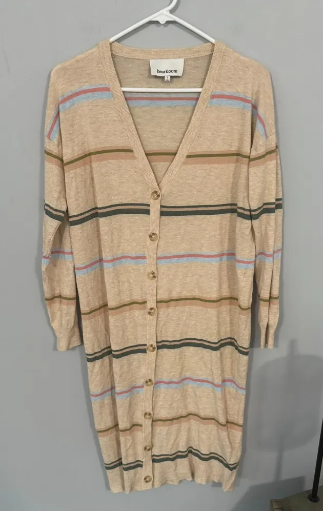 Anthropologie Heartloom Long Duster Length Button Down Cardigan Sweater in Women's Size Small. Rayon & nylon blend. Sweater is in very good used condition with no flaws or stains other than some minor wash wear. Multicolor stripes, long sleeves, v-neck. Please see close-up pictures for condition details. Mediumweight. Offers welcome. Fast shipping.