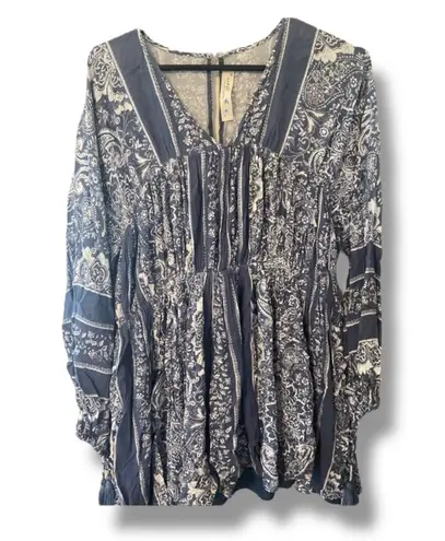 Her Entire Name Says Grace long-sleeved, v-neck mini dress in a blue and white paisley print, featu... Show more