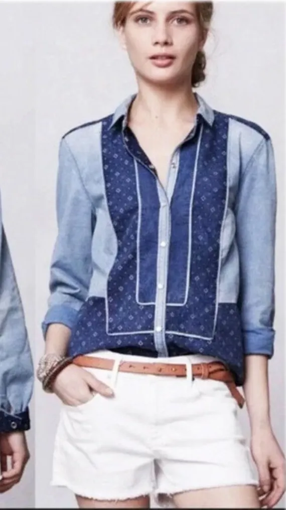 Excellent preowned condition Chambray blue cotton pearl snap shirt. Love the contrasting patterns. S... Show more