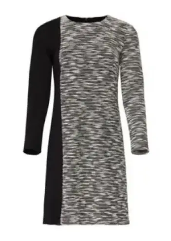 Round neckline Tweed and black ponte material Long sleeves Fitted dress Knee length