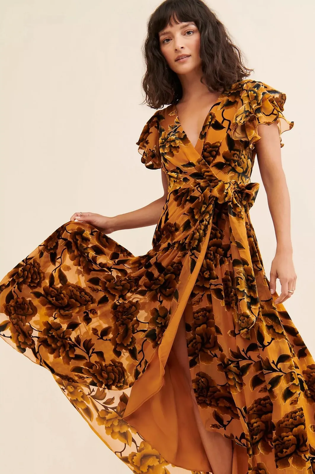 Small section on bottom has fraying as shown in photos Style No. 105392849; Color Code: 070 Length Approximately 57.25" Pit to pit approximately 14.5" - Polyester - Imported Anthropologie Hutch Zola Maxi Dress in a rich golden mustard floral print. This romantic wrap-style maxi features a flattering V-neckline, soft flutter sleeves, and a defined waist with a side tie detail. The flowing skirt has a high-low hem with beautiful movement, making it perfect for weddings, fall events, date nights, or everyday elevated wear. The lightweight, semi-sheer chiffon overlay drapes effortlessly and is fully lined for coverage. A timeless Anthropologie silhouette that works year-round and transitions beautifully from day to night. Details: • Brand: Anthropologie – Hutch • Style: Zola Maxi Dress • Color: Mustard / golden brown with dark floral print • Wrap-style V-neckline • Flutter sleeves • Side tie waist • High-low hem • Fully lined • Maxi length A flattering, feminine dress that's especially perfect for fall and special occasions.