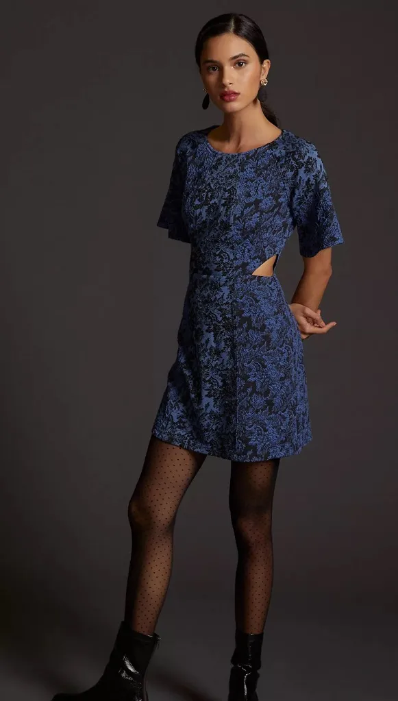 Elegant yet edgy Anthropologie jacquard mini dress featuring a rich blue and black textured floral p... Show more