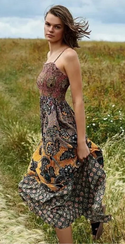 Anthropologie Jamila Smocked Maxi Dress Size medium Excellent condition! Like new Mixed prints with peacock, abstract flowers, poppies - it almost looks like butterflies Length approx 54.5” Adjustable straps Made of viscose I ship fast Boho Hippie Indie Beachy