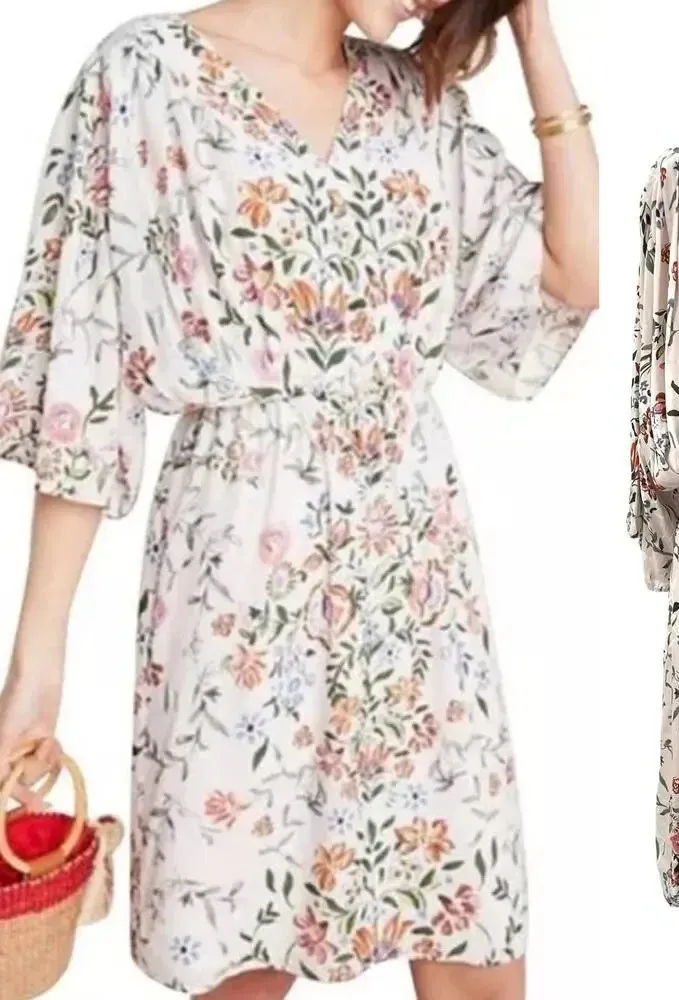 Anthropologie Laia Botanical Dress in White Floral Print V neck, dolman sleeves, elasticized waist... Show more