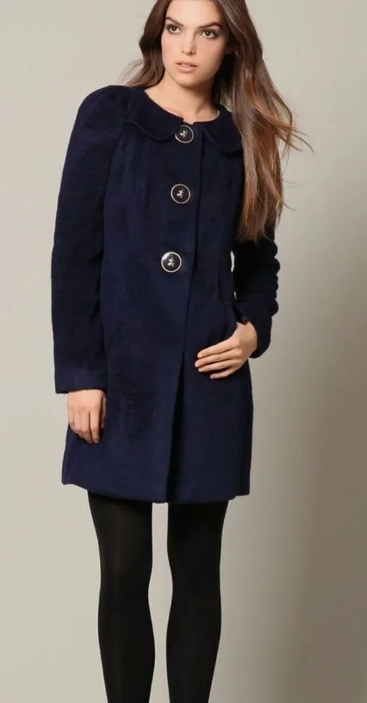 Stay stylish this winter in this navy blue fleece wool coat, which boasts a round neckline, front button closures, long sleeves, pockets, and a full lining. Pleating at shoulder, dual slit pockets at front. Vintage-inspired with a partial Peter Pan collar and charming puffed shoulders. Large, glossy buttons are gilded at the edges and centered by a rearing horse. Original price: $578 Size 6 Great preowned condition! 17.85” pit to pit 15.25” waist 34.25” length