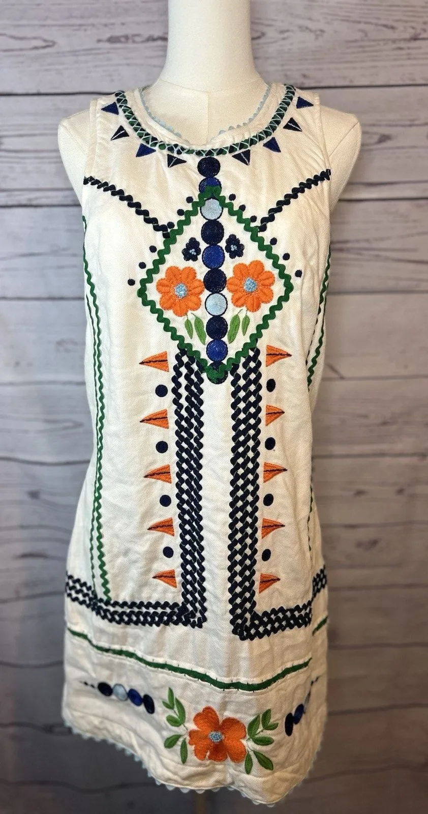 Anthropologie embroidered linen shift dress in size 4. This sleeveless dress features vibrant geomet... Show more