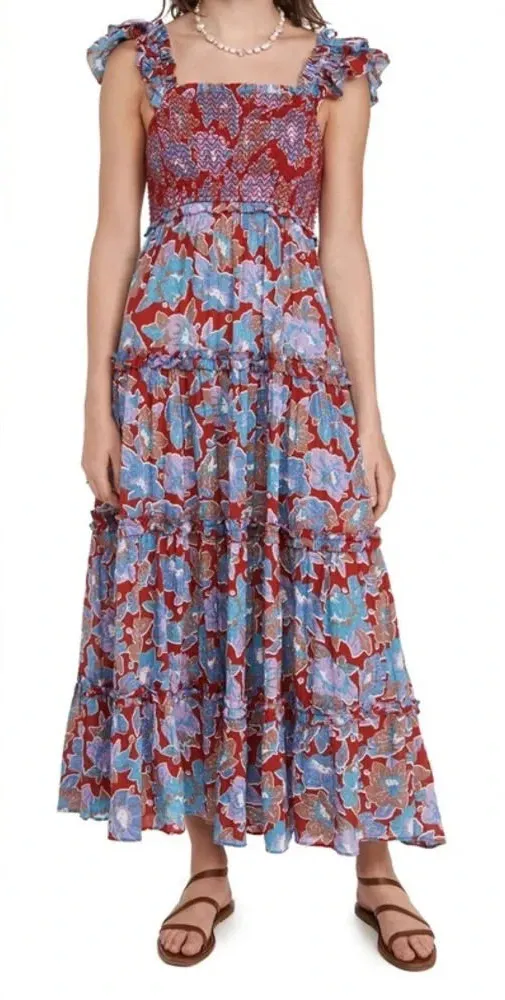 Ruffle, flutter sleeve Smocked bodice Tiered ruffled skirt Maxi length Pullover style 100% Cotton S... Show more
