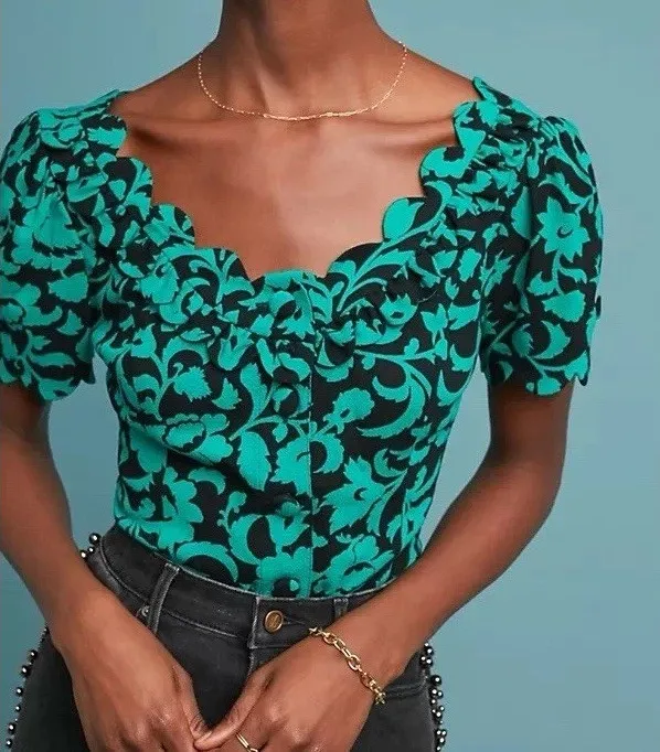 Anthropologie Maeve Aseey blouse in black and green floral jacquard. Features a scalloped neckline, puff short sleeves, and front button closure. Fitted silhouette with lightweight woven fabric and slight stretch for comfort. Details: • Brand: Maeve by Anthropologie • Style: Aseey Blouse • Size: 0 • Color: Black and Green • Pattern: Floral • Features: Scalloped neckline, puff sleeves, front buttons, fitted shape • Condition: Excellent pre-owned Maeve Aseey top, Anthropologie scallop blouse, floral puff sleeve top, green jacquard blouse, romantic fitted shirt, cottagecore, office attire