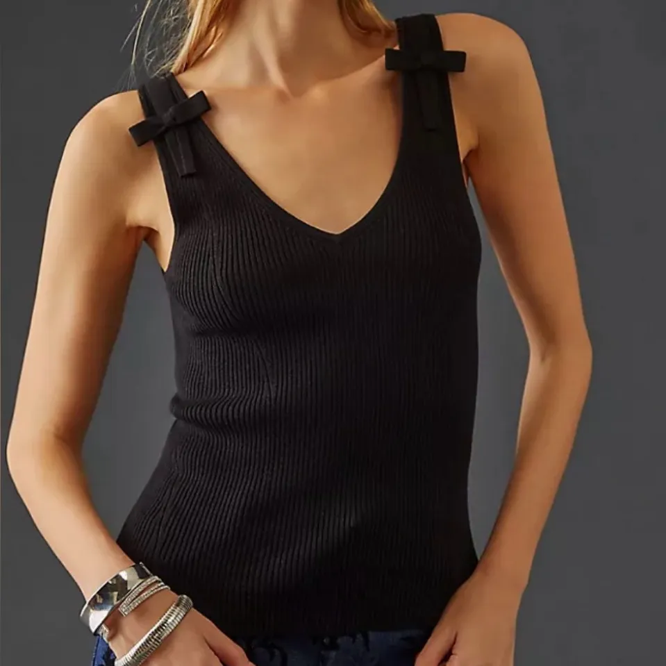 Black ribbed tank top. Features bow accents on straps. 64% viscose and 36% nylon See photos for ap... Show more