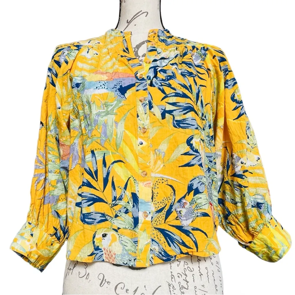 This tropical Maeve blouse has parrots, foliage, and butterflies. It buttons down the front and has puff sleeves. XS • 100% Cotton • Puffed sleeves • Button front • Bright multi colored Measurements: Pit to pit - Length - Jungle, summer, festival, spring, parrot, Jimmy Buffet, colorful, loud, patterned, tropical, cotton, lightweight