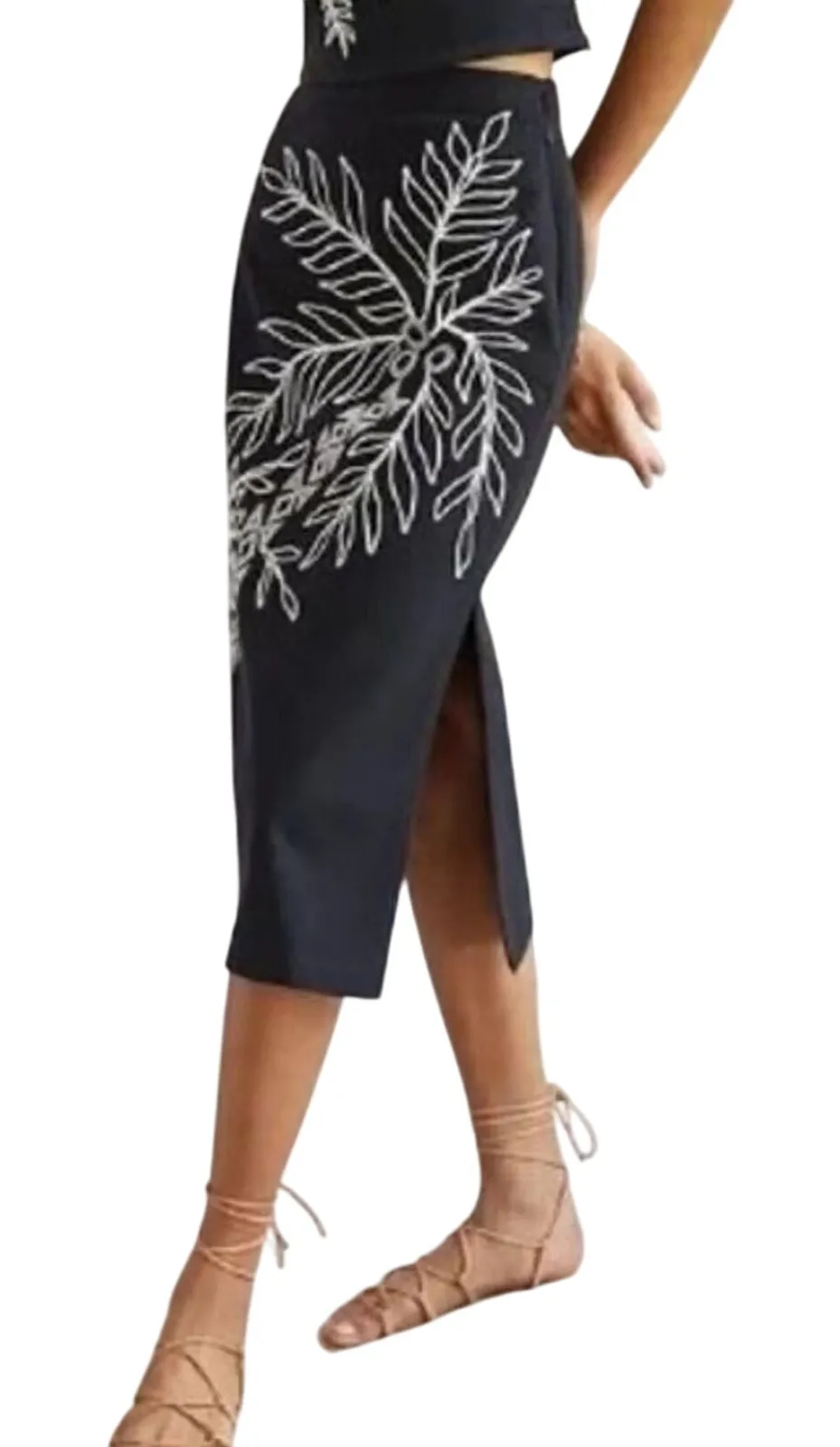 Anthropologie Maeve Embroidered Palm Tree Midi Skirt Size US 6 New with Tag MSRP $98 100% Cotton Embroidered detail Midi silhouette Lined Side zip Machine wash Color is black with cream embroidered motif Flat Lay Approx. Meas. (inches): Size: US6 Waist: 14 Hip: 20 Length: 31