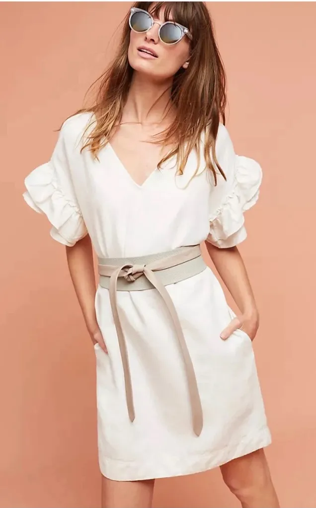 Women's Antropologie Maeve Lottie dress + v-neck style + right above knee length + fluttered sleeves + ivory in color + cotton / linen blend material + side pockets as shown + NWT / no flaws + approx measurements, pit to pit: 20in & length: 35.5in + retails for $138 + ships from 100% smoke free home