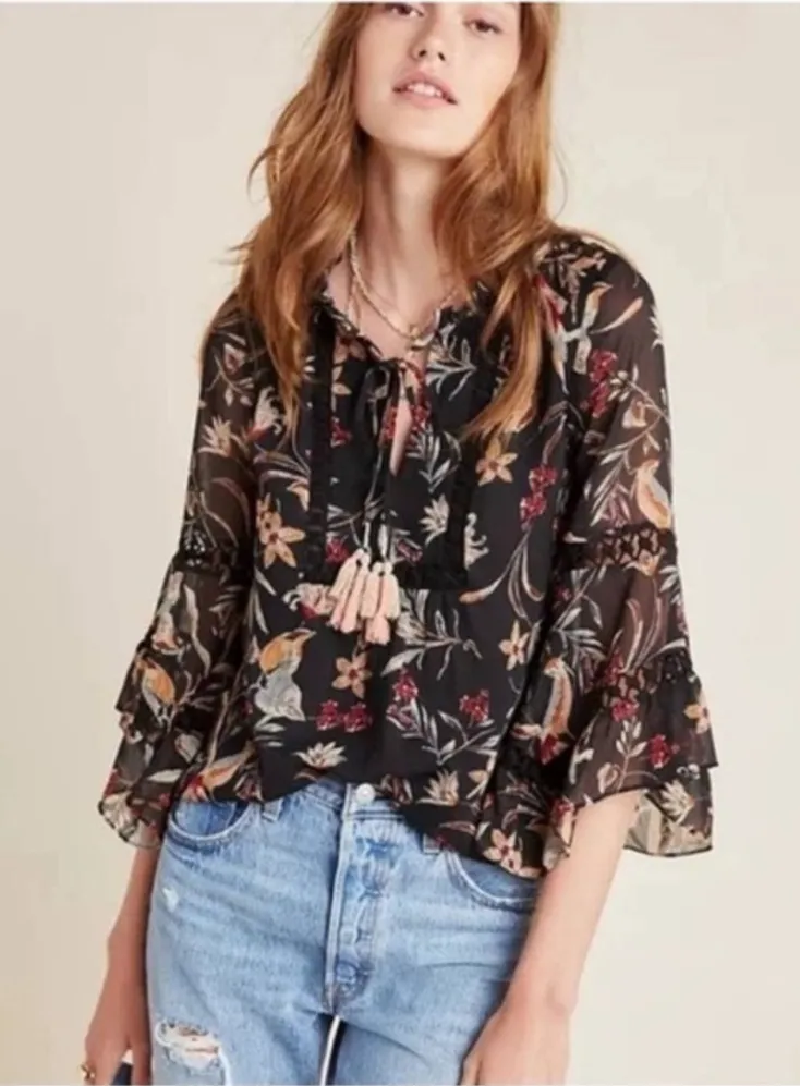 EUC Lightweight polyester floral peasant style top Lots of details Loose fit Ptp 18” Length 22”... Show more