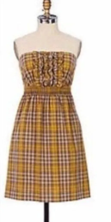 Anthro Maeve Pearland Dress size Medium Darling mustard and taupe plaid strapless dress! So many lo... Show more