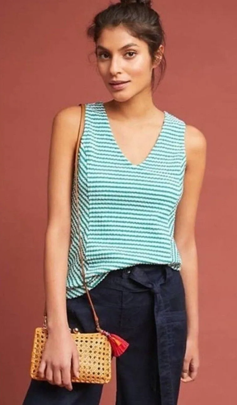 The Anthropologie MAEVE Textured Green & White Striped FRANCONIA Tank Top in size Small is a stylish and versatile piece for casual occasions. This sleeveless tank top features a V-neckline, asymmetrical sleeve, and is made of a comfortable polyester cotton spandex material. The tank top has a regular fit and is machine washable for easy care. With a colorful and bohemian theme, this tank top is both breathable and stretchy, making it a great addition to any wardrobe for those looking for a classic yet trendy top.