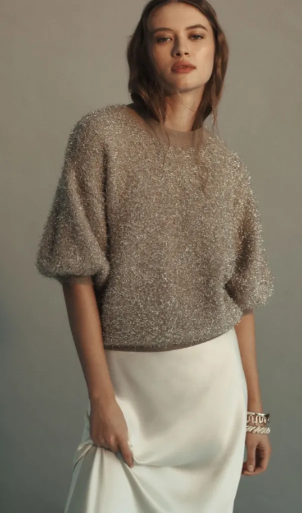 New with tag, size XL The name "Maeve" references a purple flower, a Greek goddess and a famously beautiful Irish warrior queen, all inspirations for this structured, delicate Exclusive to Anthropologie, Maeve designs are refined, flattering and endlessly wearable. Tinsel-inspired sweater w/ metallic threading throughout and back cutout detailing Pullover styling Nylon, wool, acrylic, viscose, polyester, elastane Smoke free and pet free home