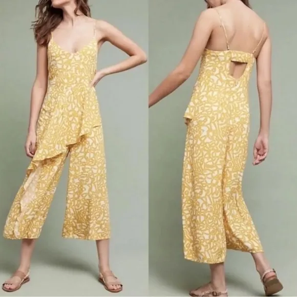 Anthropologie Maeve US 6 Goldenrod Brittany Sleeveless Ruffle Jumpsuit. Brand: Anthropologie: Maeve Size: US 6 Color: Yellow & White Material: 100% Viscose Condition: brand new with tags Wide leg crop pants. Back zipper. This is perfect outfit for summer. Very trendy. Measurements: Bust: 15" Waist: 16”