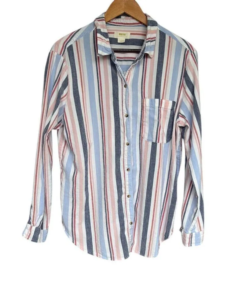 This Maeve button-up shirt in size XL features a multicolor striped pattern and a collared neckline. Made from a blend of rayon, cotton, and linen, it offers a relaxed fit with long sleeves, making it suitable for casual occasions in the spring. The shirt is machine washable for easy care. It is pre-owned, excellent condition. Size: XL Color: Multicolor Type: Button-Up Department: Women Style: Basic Material: Rayon, Cotton, Linen Neckline: Collared Sleeve length: Long Sleeve Pattern: Striped Fit: Relaxed Occasion: Casual Closure: Button Season: Spring Garment care: Machine Washable 0291