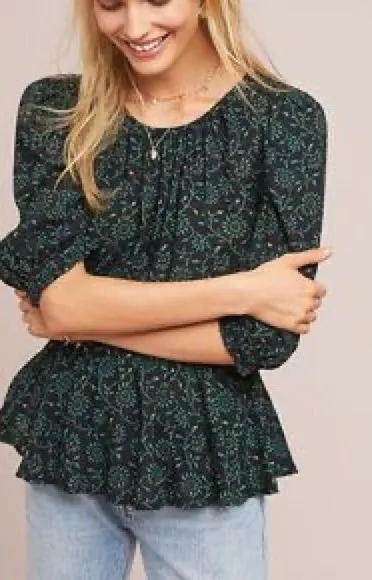 Anthropologie Meadow Rue Black Leaf Garden Floral Blouse Top Puff Sleeve Size XL - $25 - From Vanessa