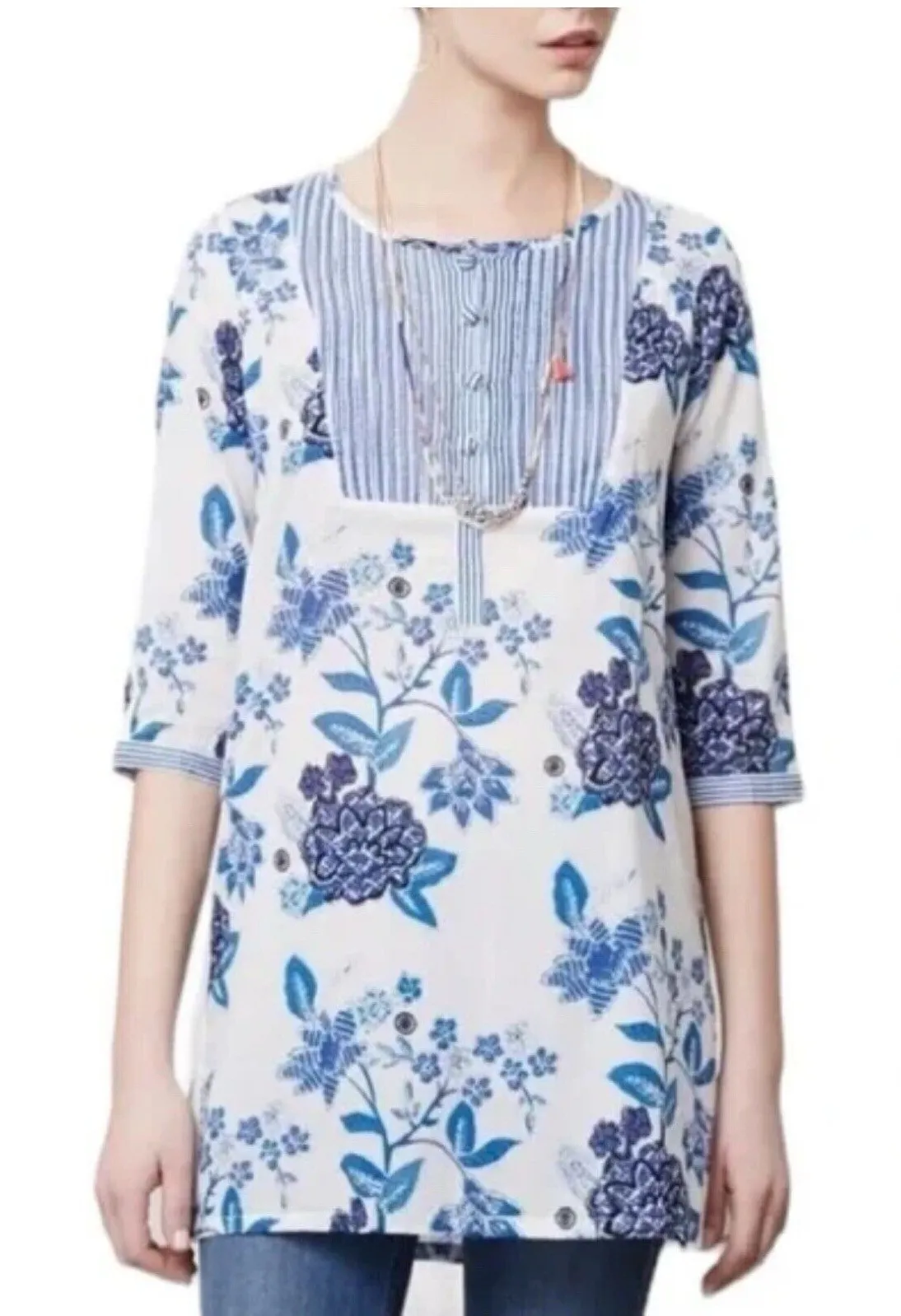 This Anthropologie tunic top features a mermaid character and a floral/stripe pattern, perfect for a... Show more