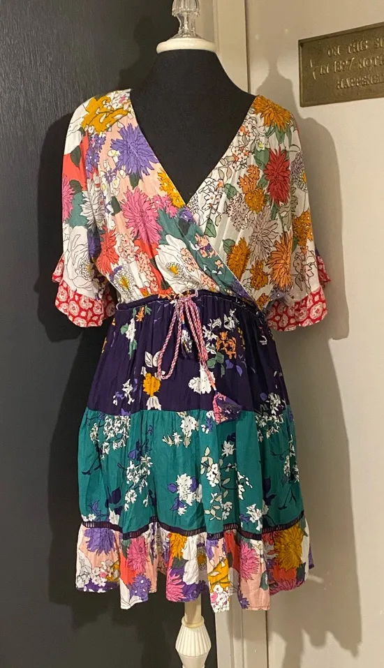 πŸ’œ Anthropologie Mixed Print Pattern Boho Dress Tie Waist & Ruffle Tier Skirt Pink - $56 - From Kailey