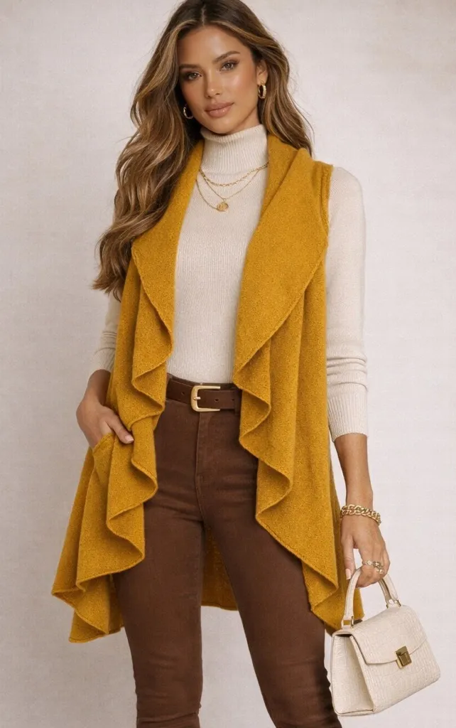 Anthropologie Moth Cascades Shawl Sweater Vest Cardigan in a rich mustard yellow. This cozy and effo... Show more