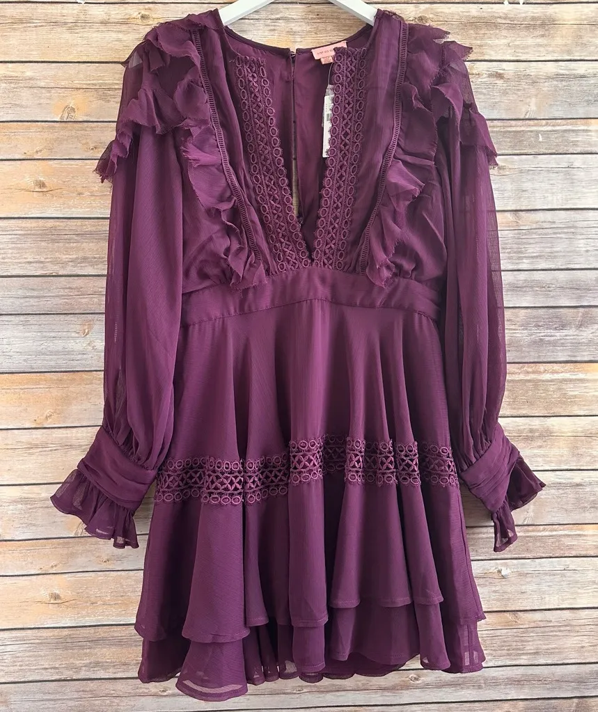 Anthropologie Not So Serious plum purple mini dress with ruffle details, deep v-neck, sheer sleeves,... Show more