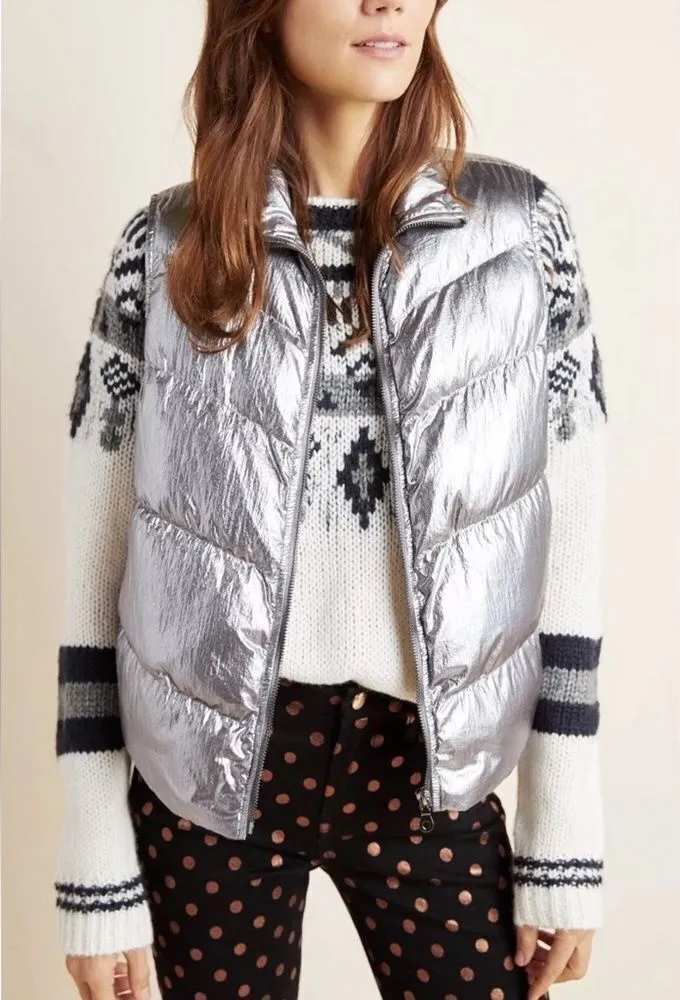 ANTHROPOLOGIE NWOT Women’s Metallic Foil Puffer Vest Zip Front Silver XS Shine in this stylish sil... Show more