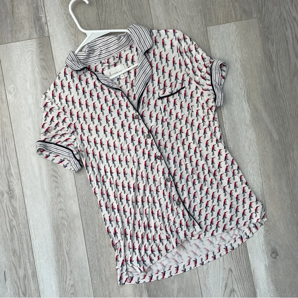 Anthropologie Bird Print Pajama Top in the color white. Collared, button front, short sleeve pajama... Show more