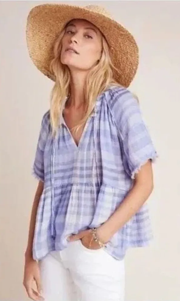 ✨Anthropologie Pilcro Casual Blouse Bette Plaid Babydoll Blouse Lavender Size: Large Oversized bab... Show more