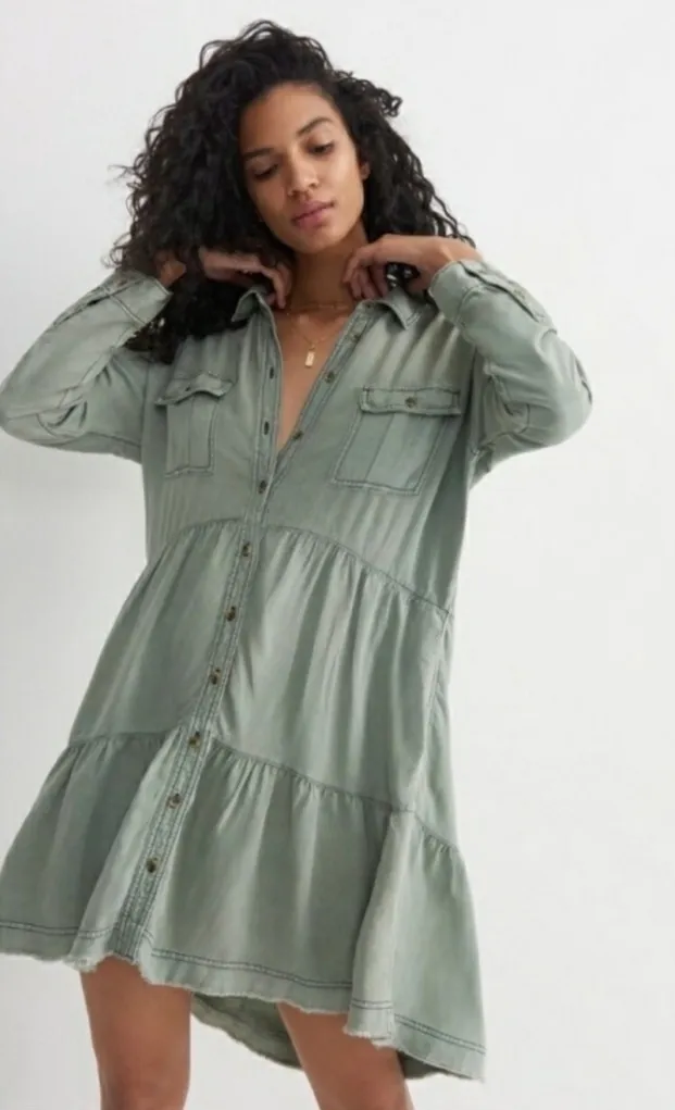 Anthropologie Pilcro Deanne moss tiered mini shirt dress long sleeve button Green - $52 - From molly