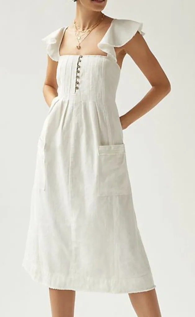 Brand: Pilcro Size: M Condition: Lightly worn Color: White Style: Midi dress Sparkle in this stunning white midi dress from Anthropologie, featuring a flutter sleeve and vintage-style buttons on the front for a beautiful silhouette. Crafted from lightweight linen and cotton blend, the white color luxuriously flatters your figure for a timeless look that will elevate any wardrobe.