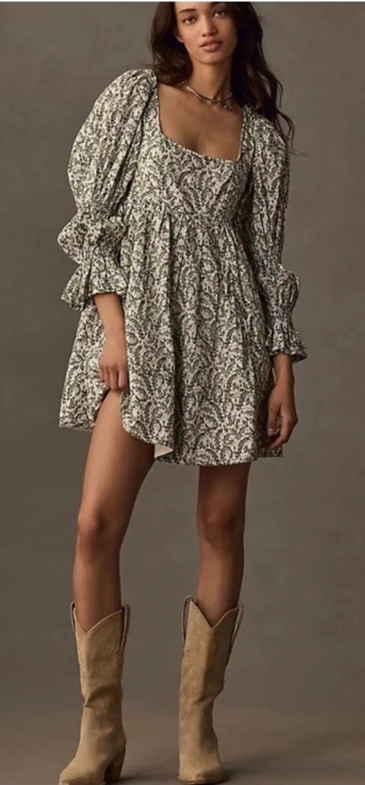 Anthropologie Pilcro Long Sleeve Babydoll Mini Length Dress Garden Green Floral Print Square Neck Li... Show more