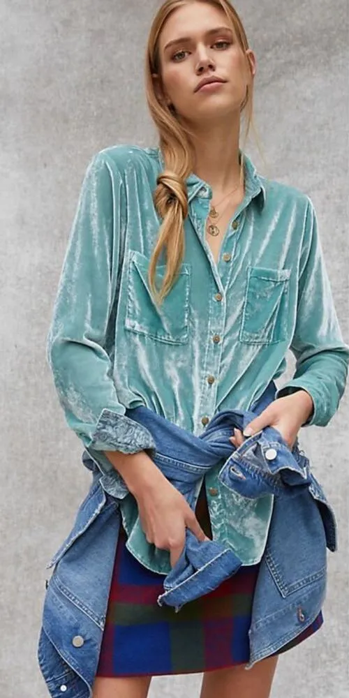 Anthropologie Pilcro Mara Relaxed Velvet Buttondown Top in Teal Blue A so-soft velvet finish infus... Show more