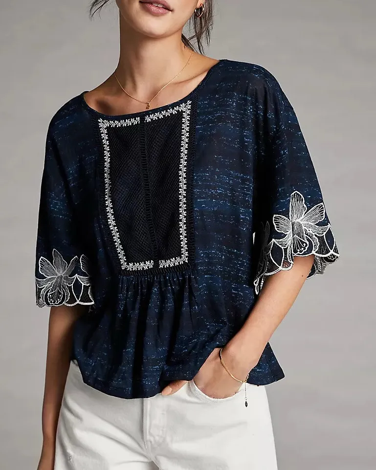 Pilcro Orchid Embroidered Flutter Sleeve Midnight Blue Floral Blouse Boxy XS Size XS flutter dolma... Show more