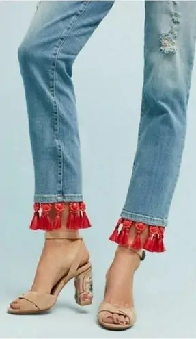 Anthropologie Pilcro Red Beaded Tassel Hem Slim Boyfriend Jeans Size 25 These are in good condition... Show more