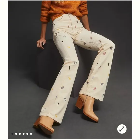 Anthropologie Pilcro The Icon Flare Corduroy Embroidered Pants Cream Size 32 Five-pocket styling Zi... Show more