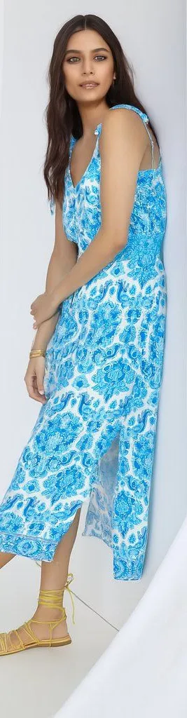 Anthropologie Plenty by Tracy Reese Smocked Baroque Maxi Dress. It features a blue and white baroque... Show more